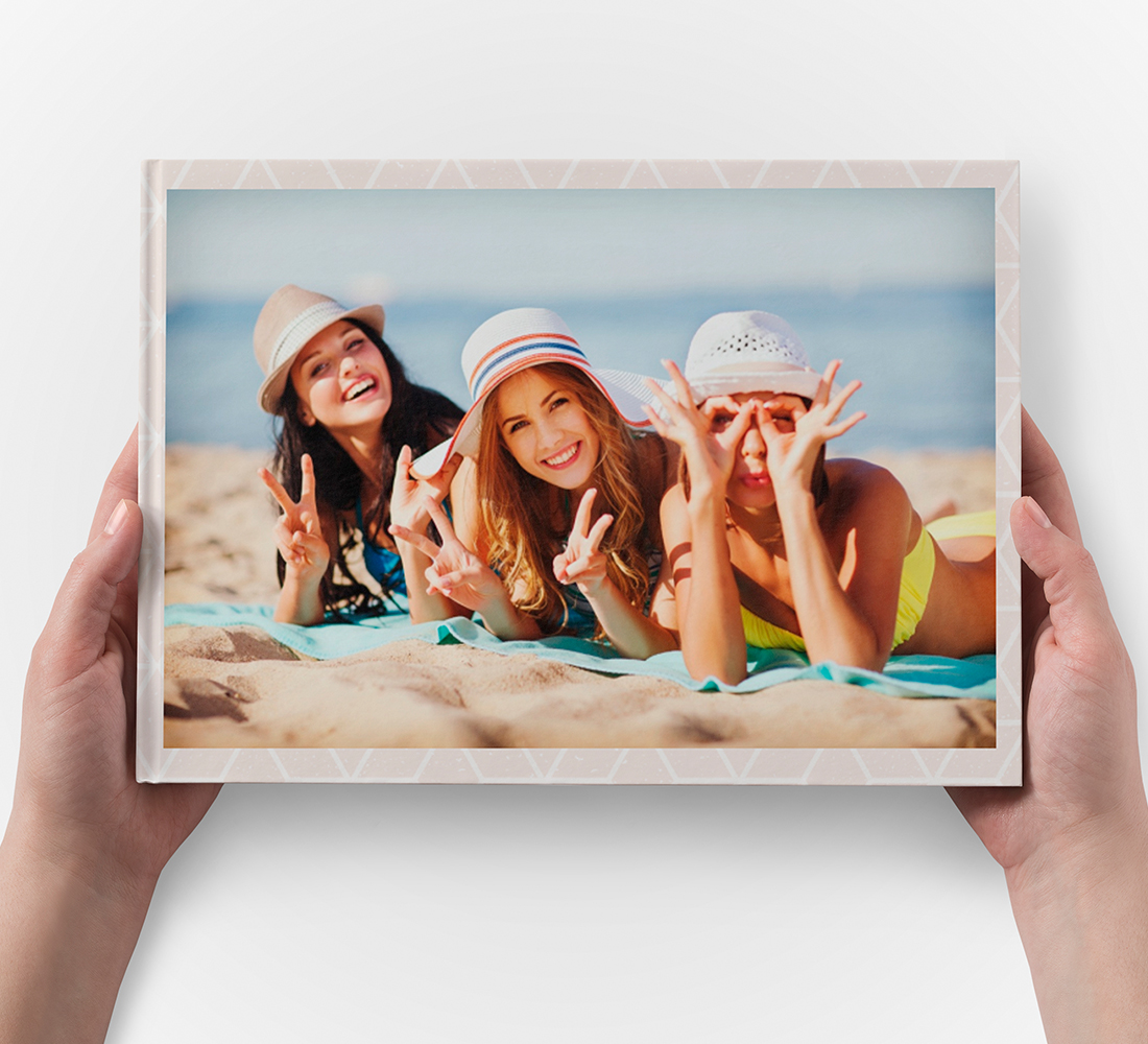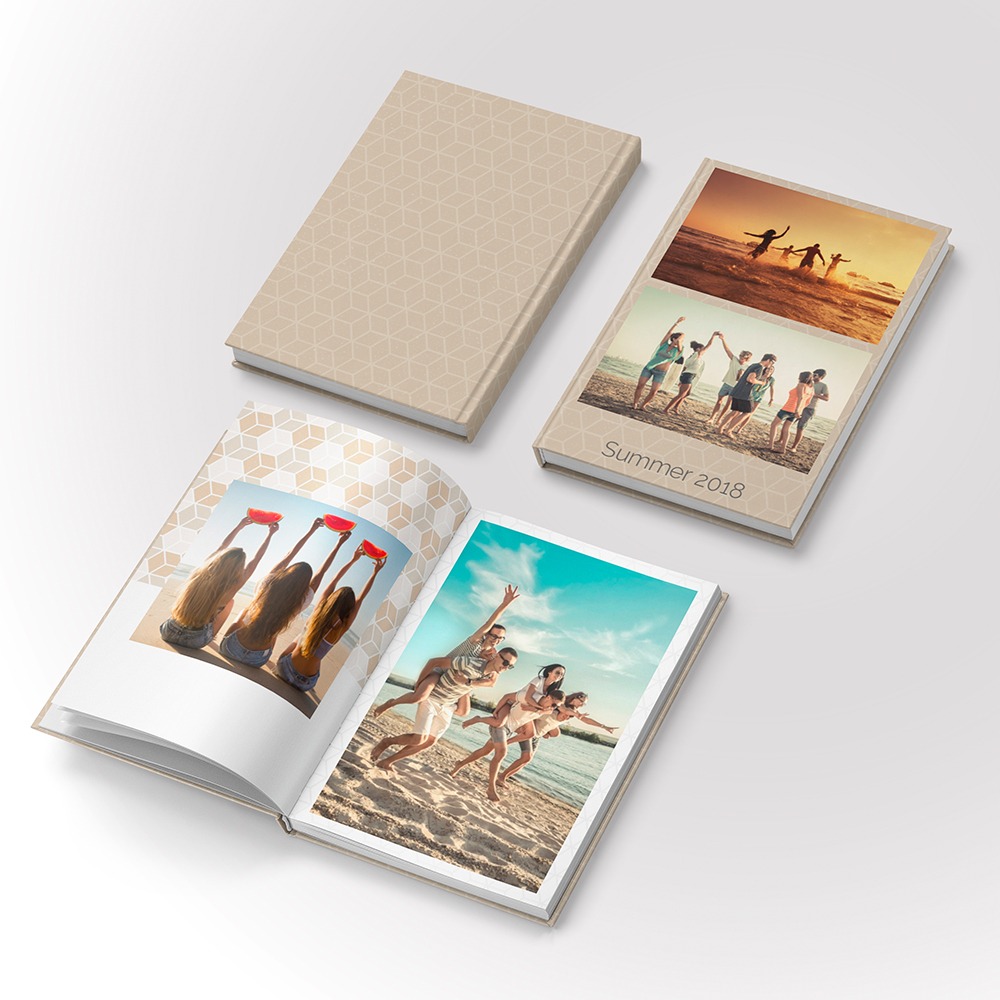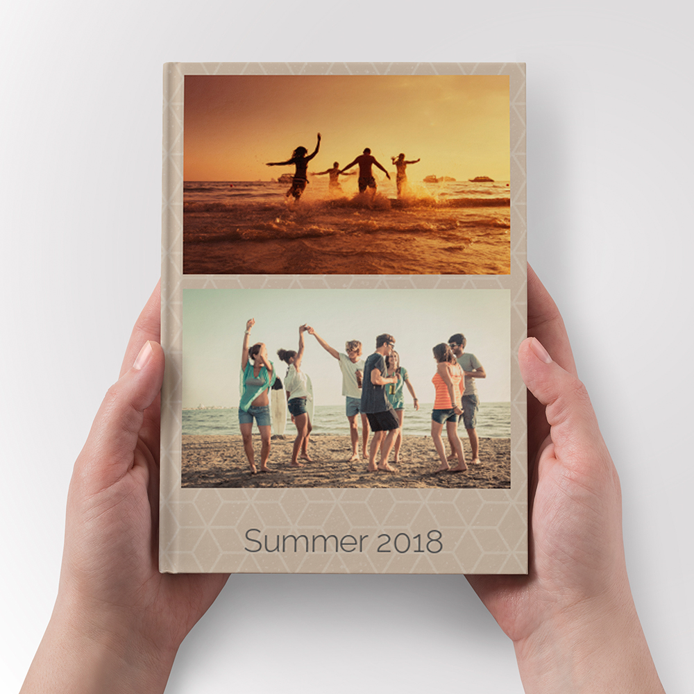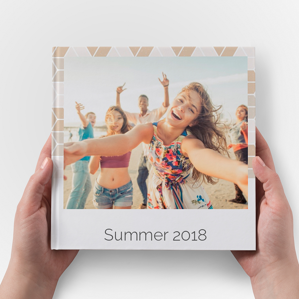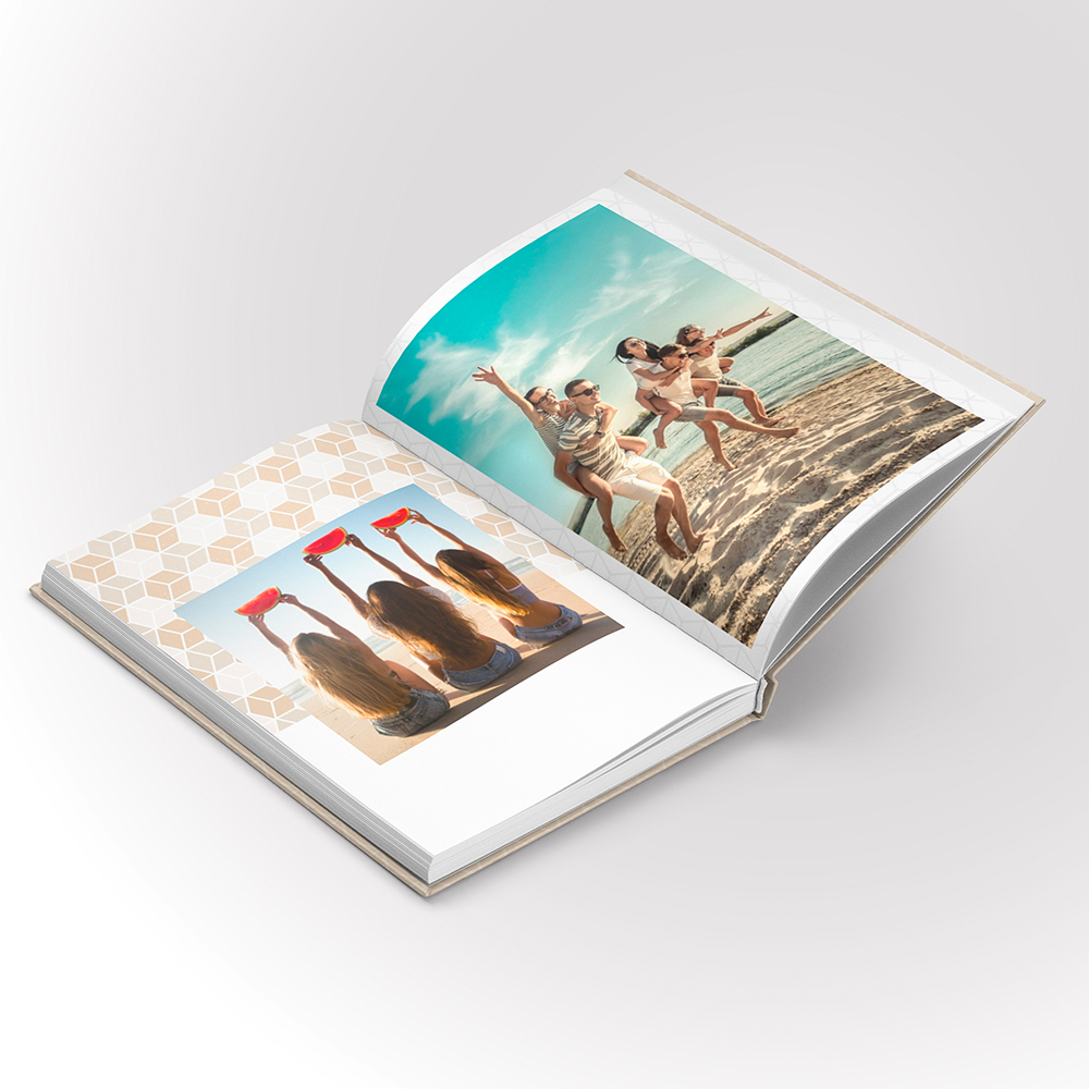Ilus beežides toonides geomeetriliste elementidega fotoraamat, mille kaanele saab panna soovitud pildi ja pealkirja.