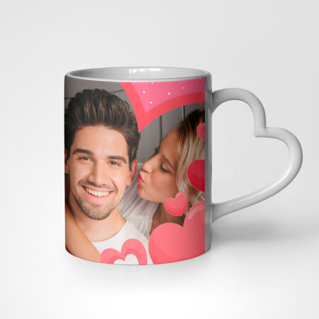 Ilusal roosa taustaga südametega kruus, mille keskele saad lisada endast, enda lähedasest või teist koos ilusa pildi. Kruusi teisele poole saad lisada teksti omal valikul.
