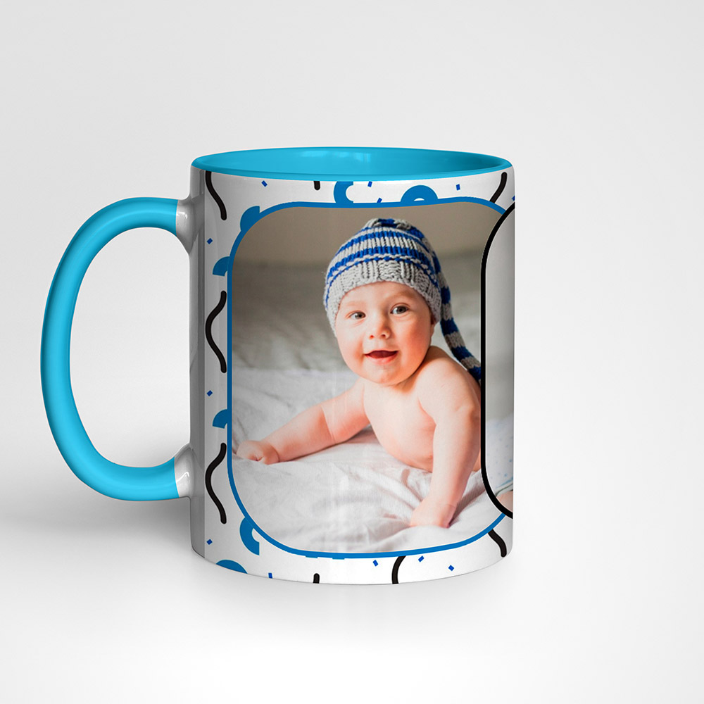 Sini-must-valged fragmendid taustal ning sinu pildid kruusi mõlemal pool suurelt.