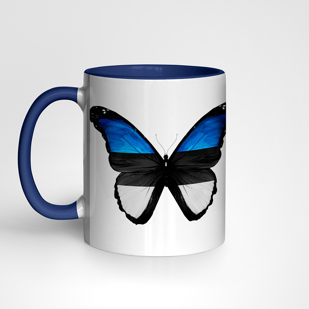 Ilusa sini-must-valge liblika motiiviga kruus, mille teisele poole saad panna näiteks enda lemmikluuletuse.