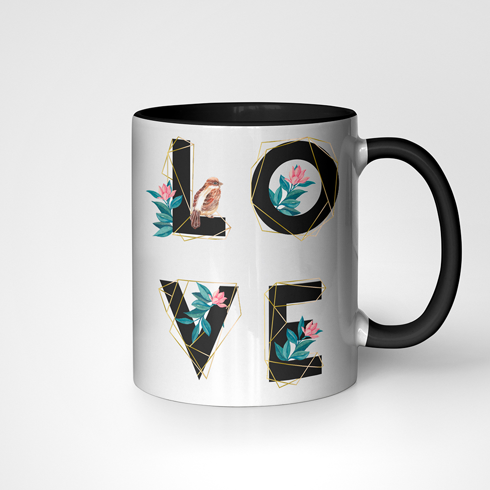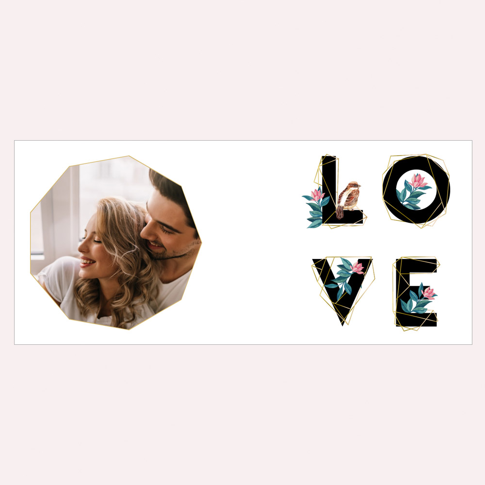 Stiilne kruus, mille ühel pool on suurelt kirjas LOVE ja teisele poole saad kuldse rombi sisse lisada pildi endast koos kallima või parima sõbraga.