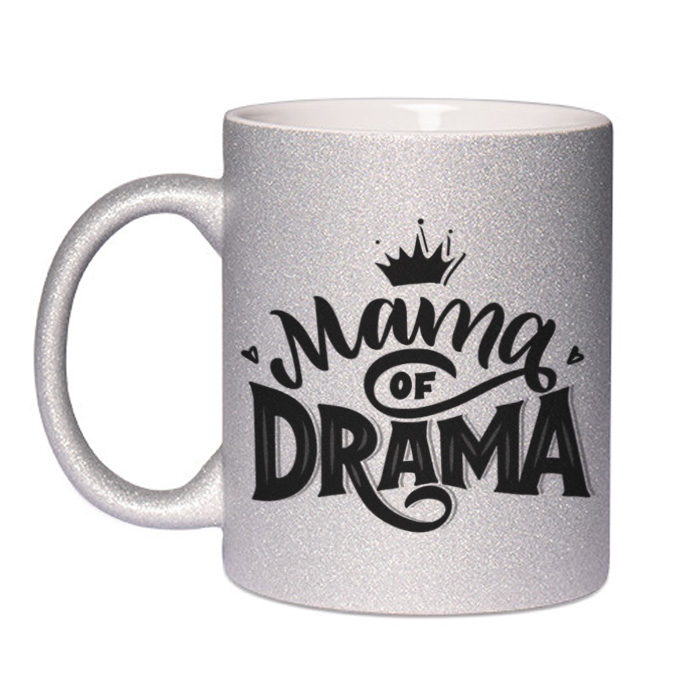 Kruus on saadaval seitsmes erinevas värvitoonis, milleks on: hele- ja tumesinine, hele- ja tume kuld ning roosa, lilla ja hõbe. Tassi ühel poolel on lahe visuaal kirjaga “Mama of drama”, teisele poole saad lisada näiteks kruusi omaniku nime.