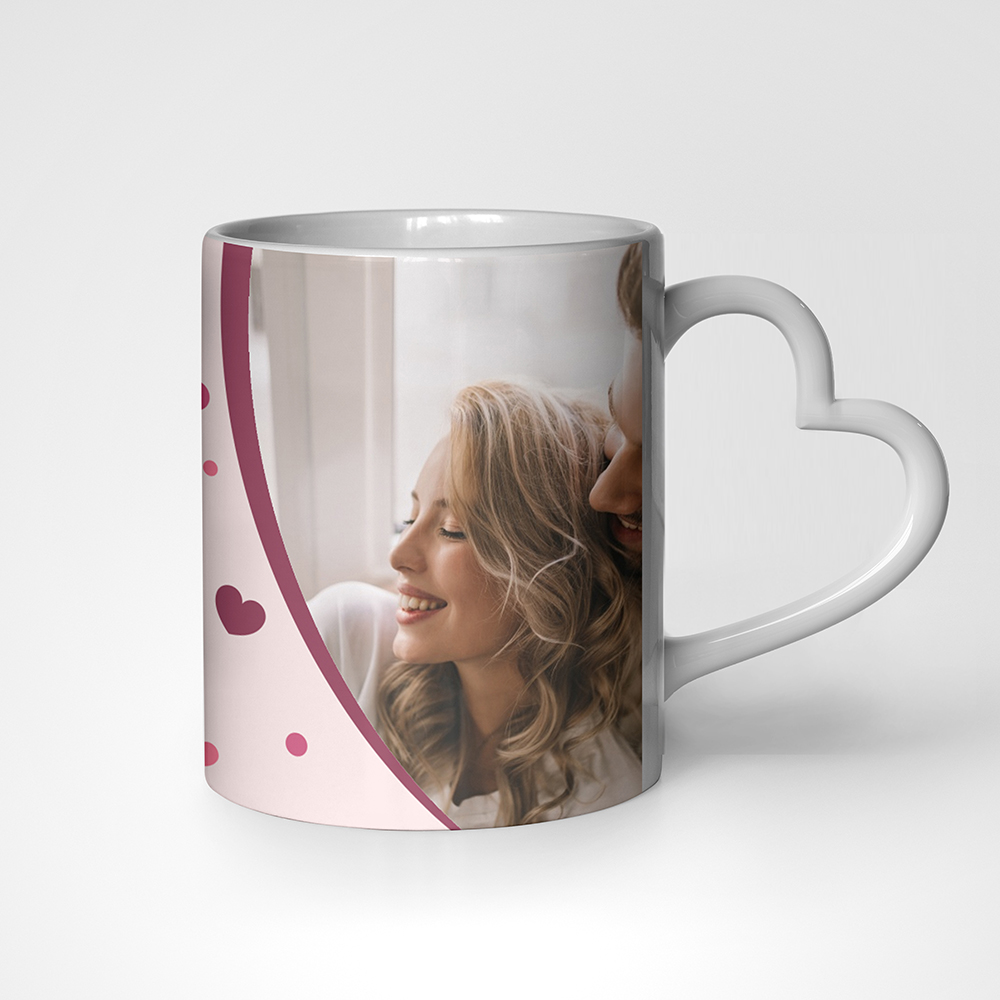 Ilusal südamete ja täpikestega roosakates toonides kruus, mida saad veelgi kaunimaks muuta enda pildi ja valitud sõnumiga.