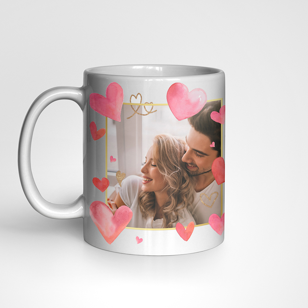 Ilusal südamete ja täpikestega roosakates toonides kruus, mida saad veelgi kaunimaks muuta enda pildi ja valitud sõnumiga.