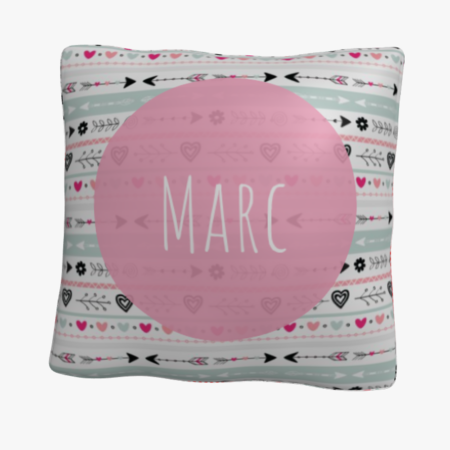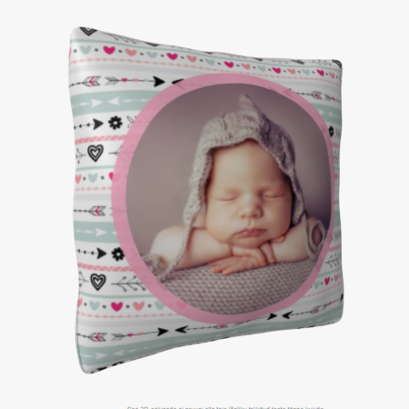 Armas südamete ja nooltega disain, mille ühele poolele saad lisada pildi ning teisele küljele teksti, näiteks padja omaniku nime.